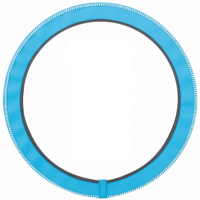 Blue steering wheel cover with white stitching
