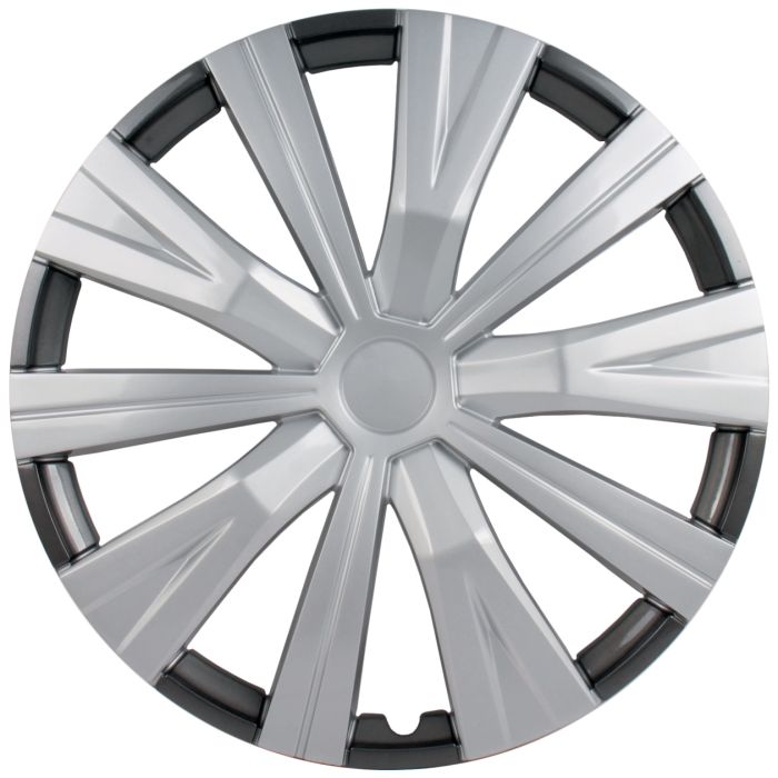 \nElevate your vehicle's style and protect your wheels with this set of four silver and charcoal 16-inch wheel covers. Make a bold statement on the road with this combination of aesthetics and practicality.