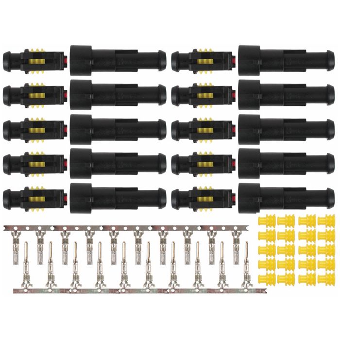 Weatherproof electrical terminal connector set, specifically designed for 1.5mm cables. This pack includes 10 sets of connectors, making it ideal for automotive and marine applications where weather resistance and reliable electrical connections are crucial. Each pack provides a comprehensive solution for secure and weatherproof electrical terminations.