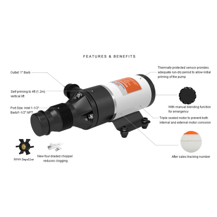 \nHigh Flow Rate: The pump offers an impressive open flow rate of 12.0 gallons per minute (45.0 liters per minute), ensuring fast and efficient waste evacuation from holding tanks and other receptacles. This exceptional flow rate helps you quickly manage waste, allowing you to focus on enjoying your time on the water.