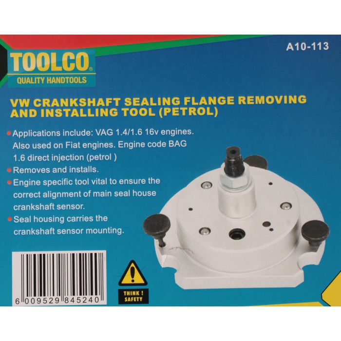 Ensure precise removal and installation of the crankshaft sealing flange on Volkswagen 1.4/1.6 16V petrol engines, including applications for Fiat engines with engine code BAG (1.6 direct injection petrol). This specialized tool from Toolco is essential for maintaining correct alignment of the main seal housing and crankshaft sensor mounting, crucial for optimal engine performance and reliability.