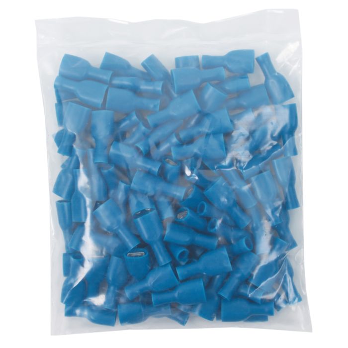 The Blue Female Terminals - 6.3mm (100 Pack) is a premium solution for creating secure and efficient electrical connections across a variety of applications. Designed with precision engineering and crafted from durable materials, these connectors ensure reliable performance for automotive, marine, industrial, and household projects. Their vibrant blue insulation allows for quick identification and adds a professional touch to any wiring setup.